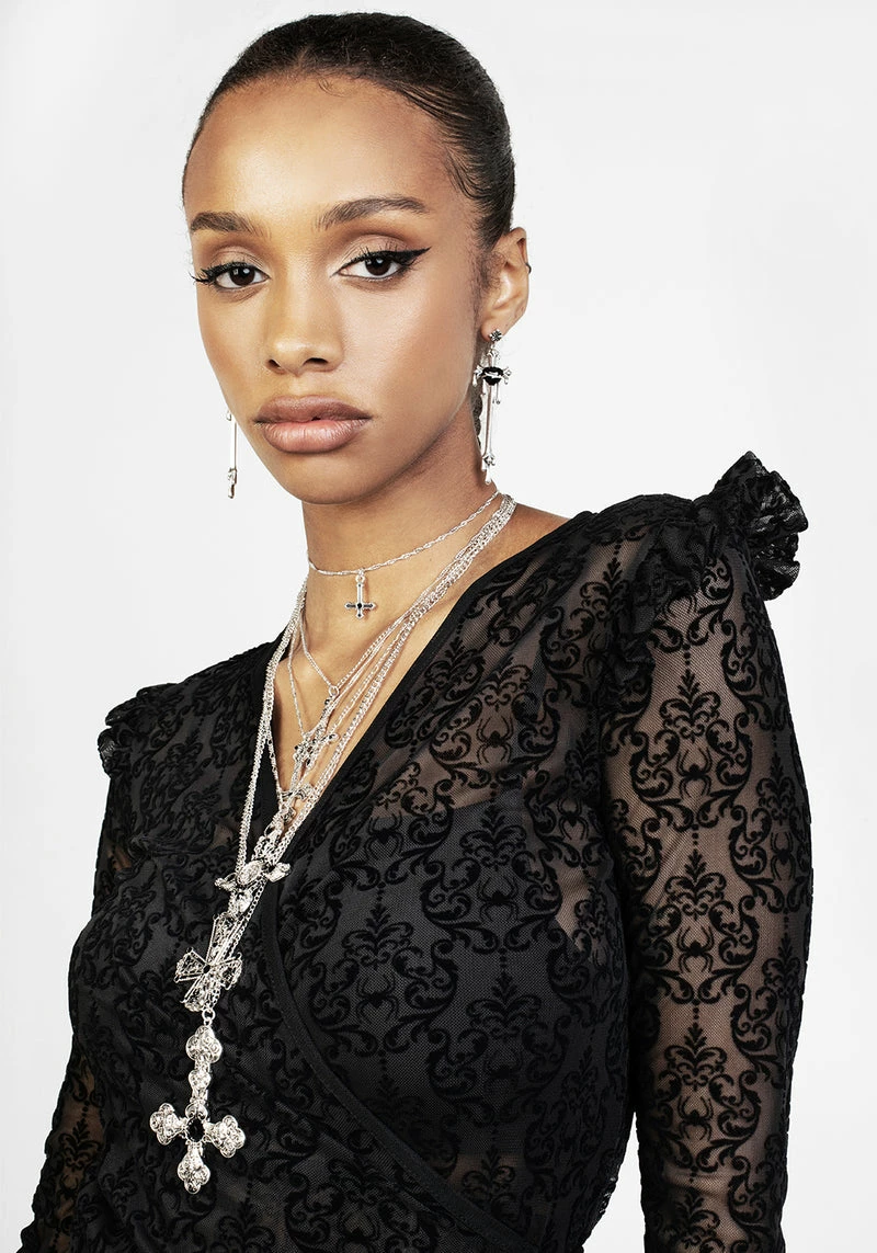 🕸 Sheer mesh with all-over flocked baroque design