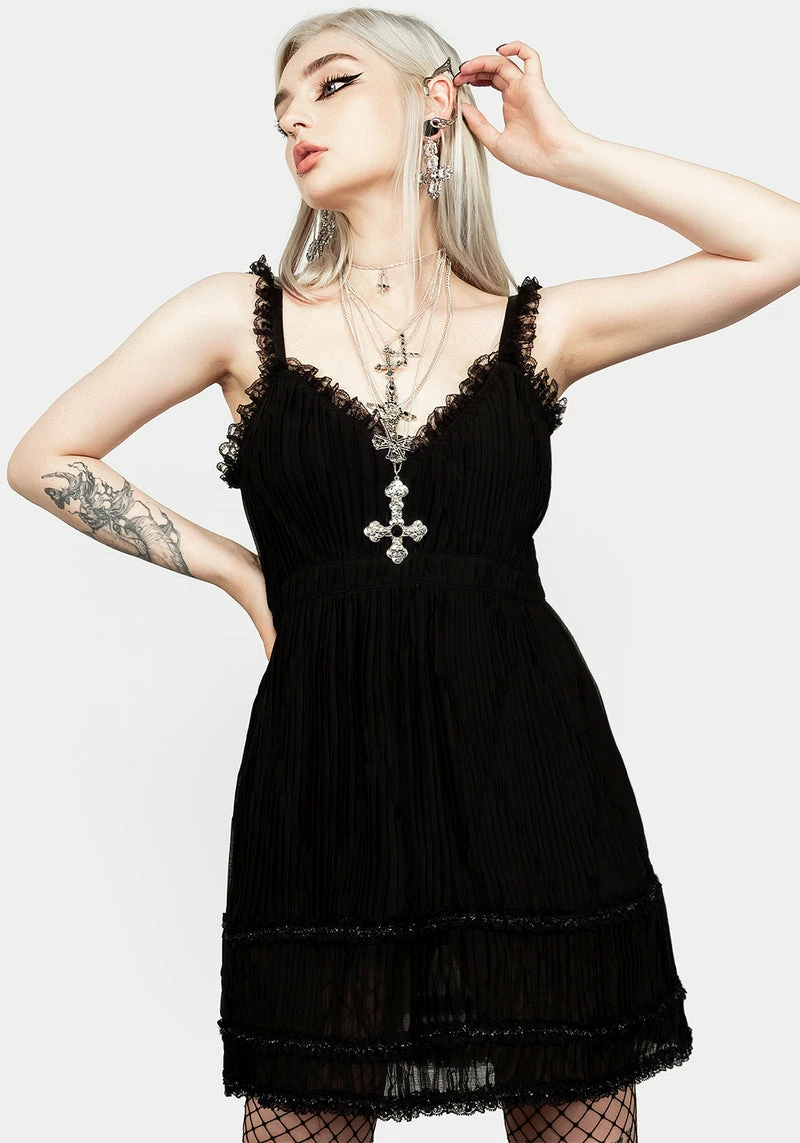 ✦ Silky pleated sheer mesh overlays solid black liningÂ
