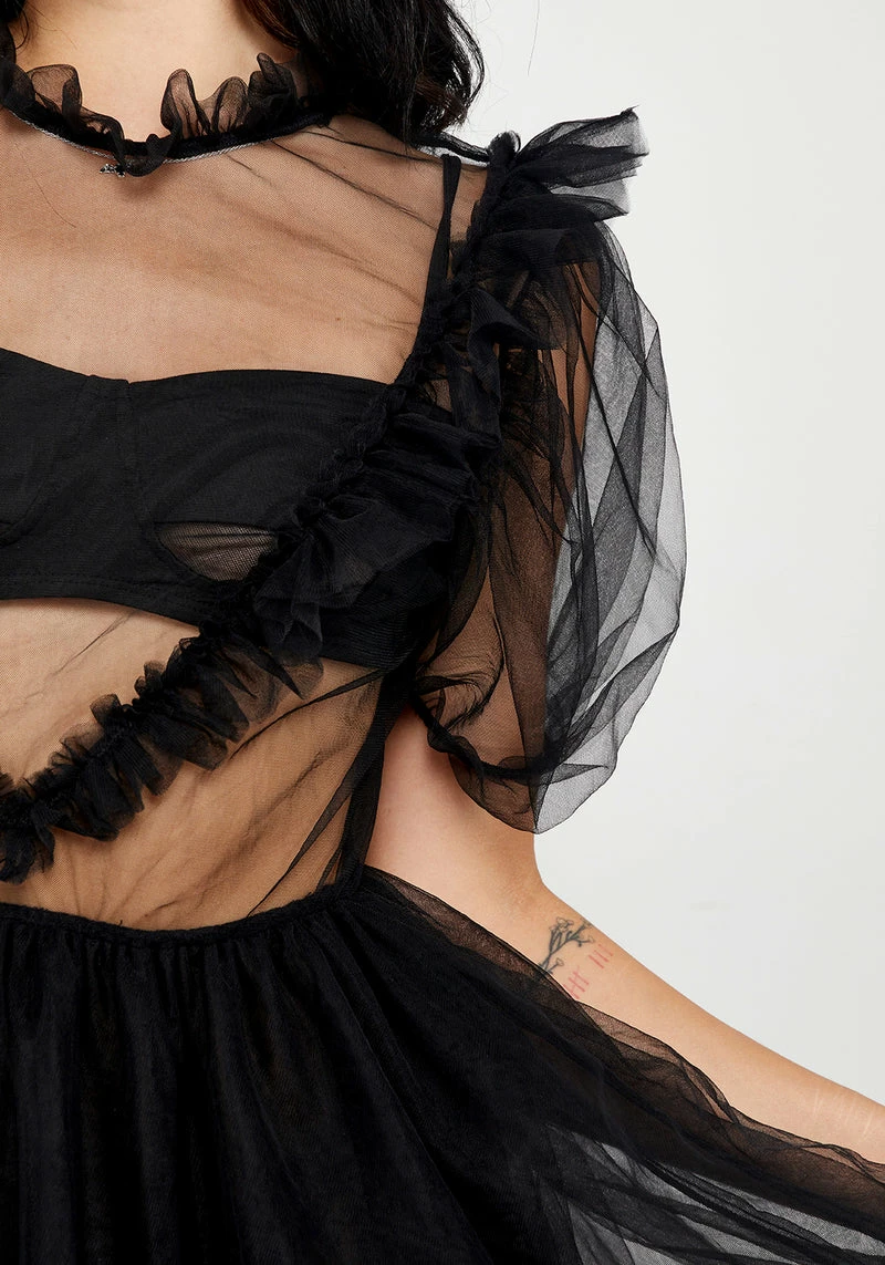 ✦ Sheer ruffled high-necked collar and short balloon sleeves give a regal silhouette