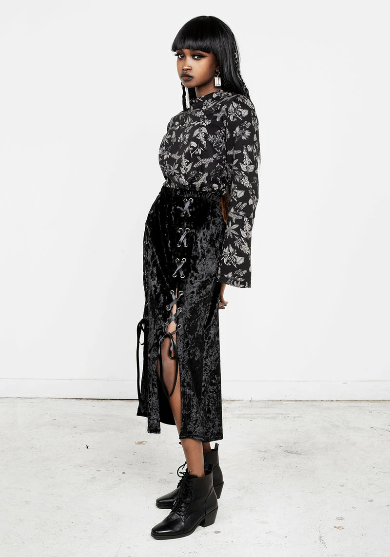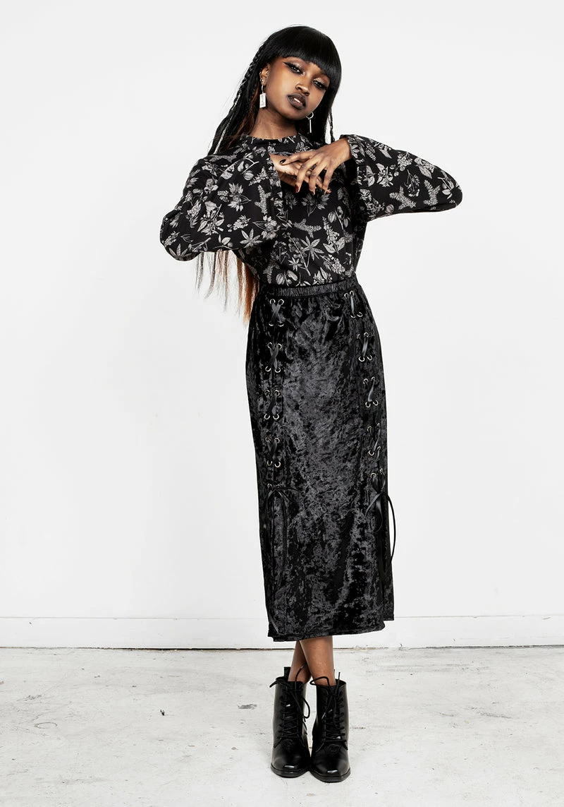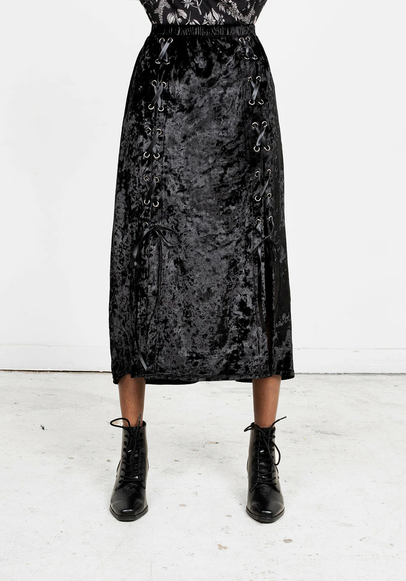 ❦ Lace-up midi skirt in black velvet