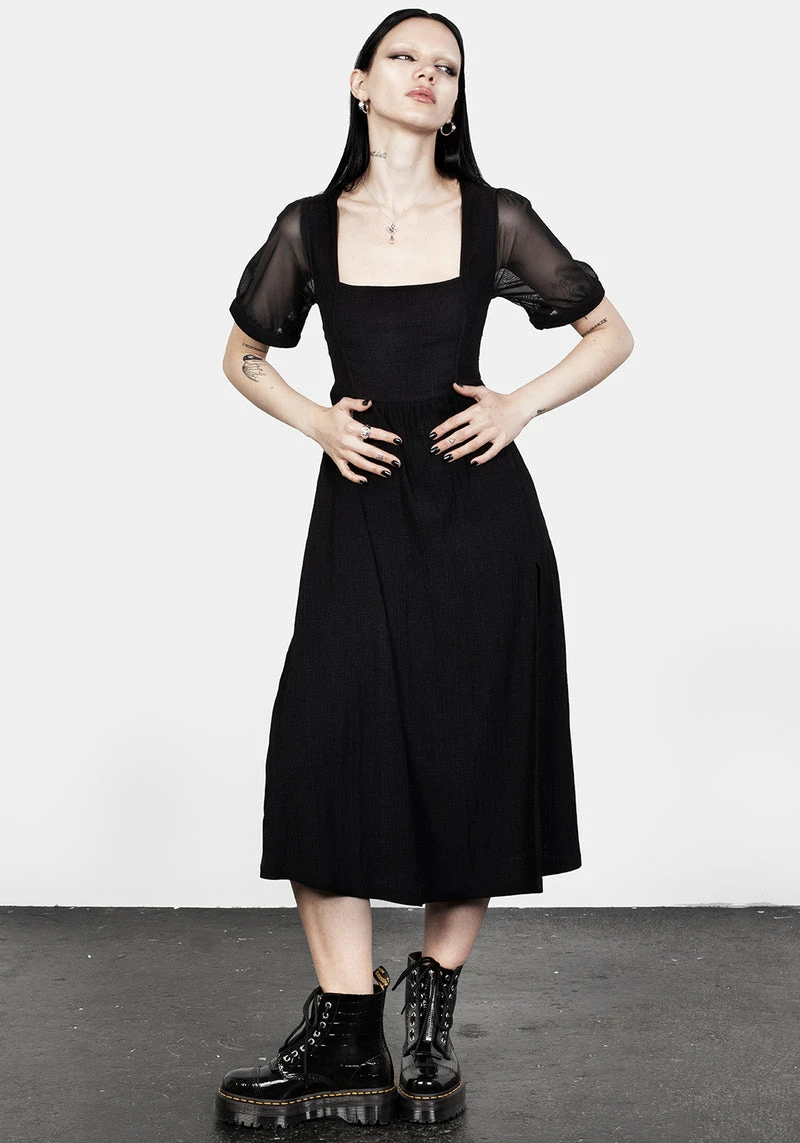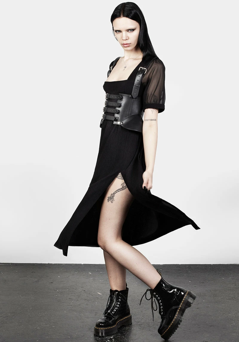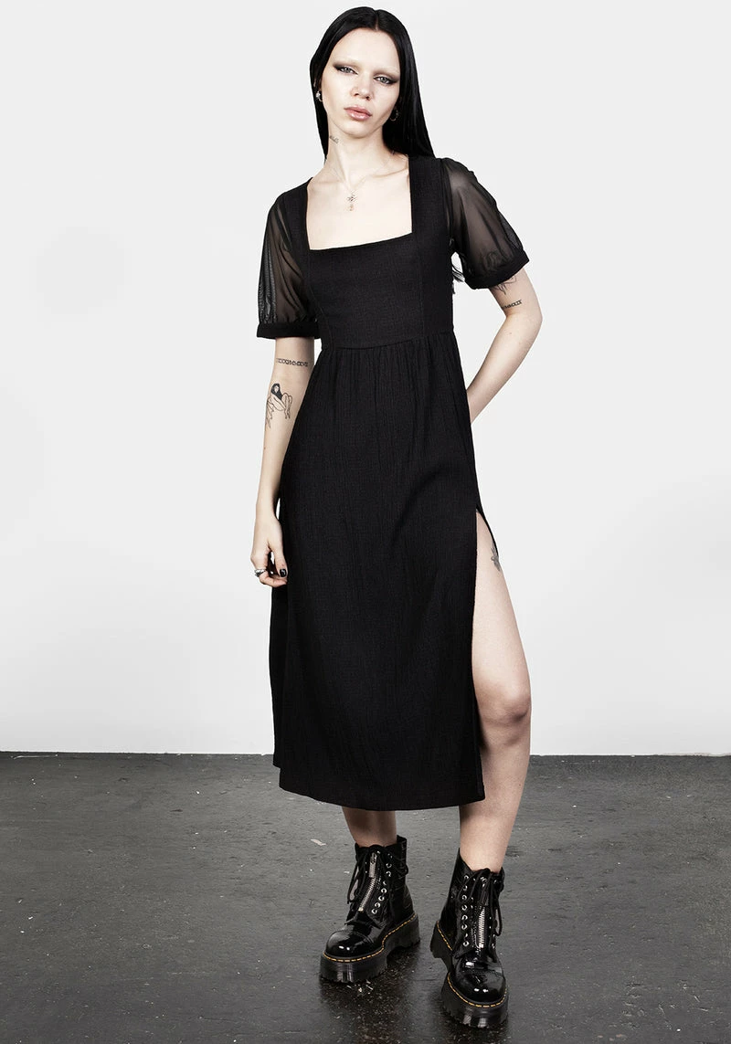 – Fitted bodice with flowy mid-length skirt (high leg side split amps up the drama)