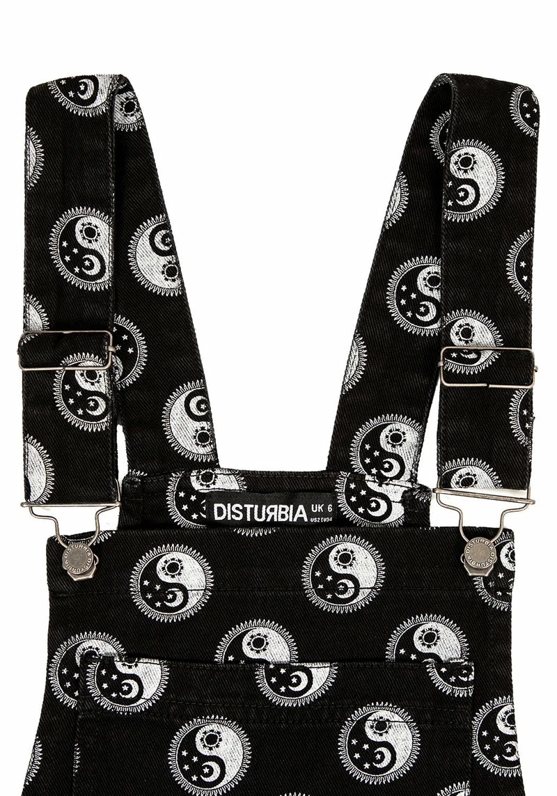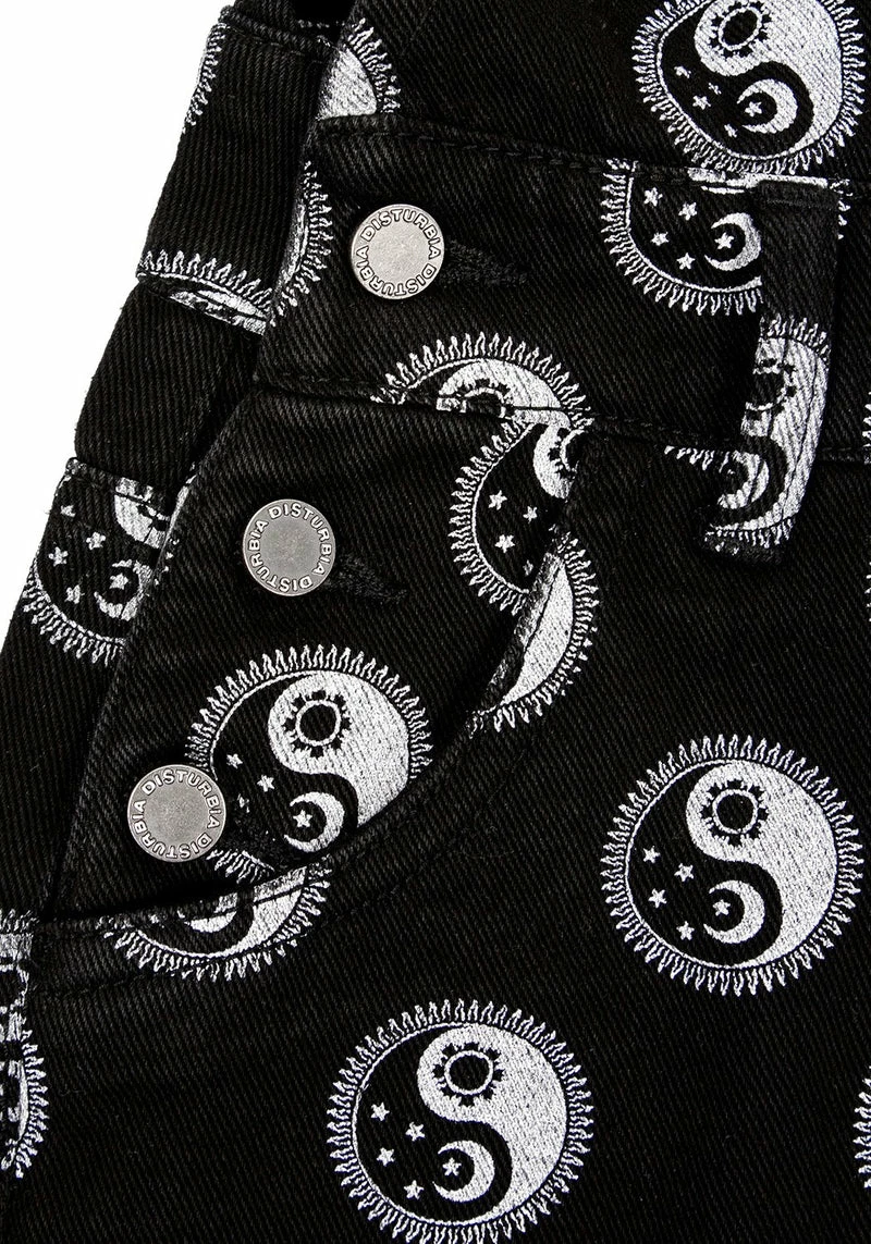 â Black denim short dungarees with all-over yin yang print