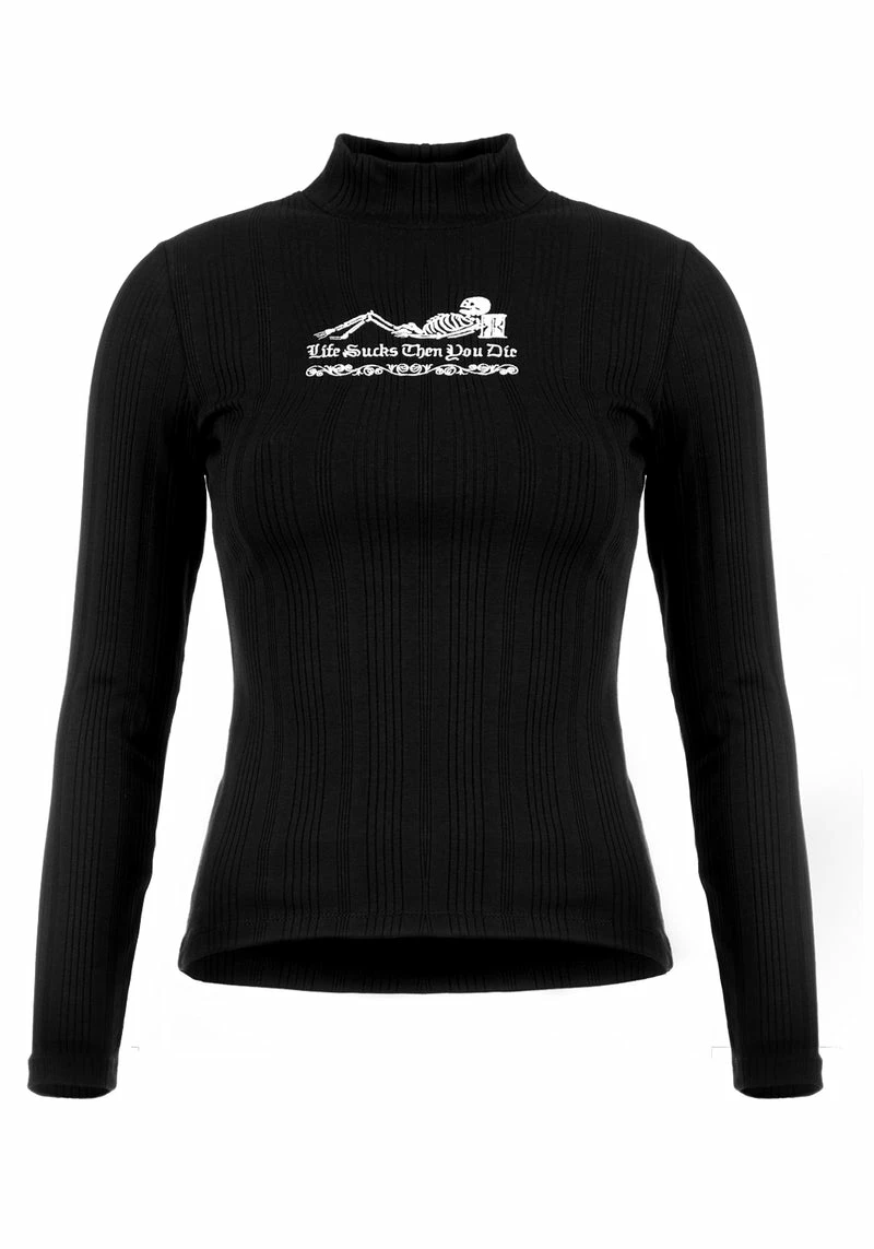 ✧ Front chest embroidery reads ‘Life Sucks Then You Die’ with skeleton design in white