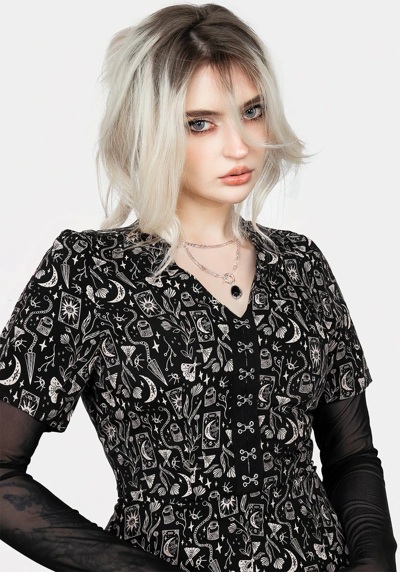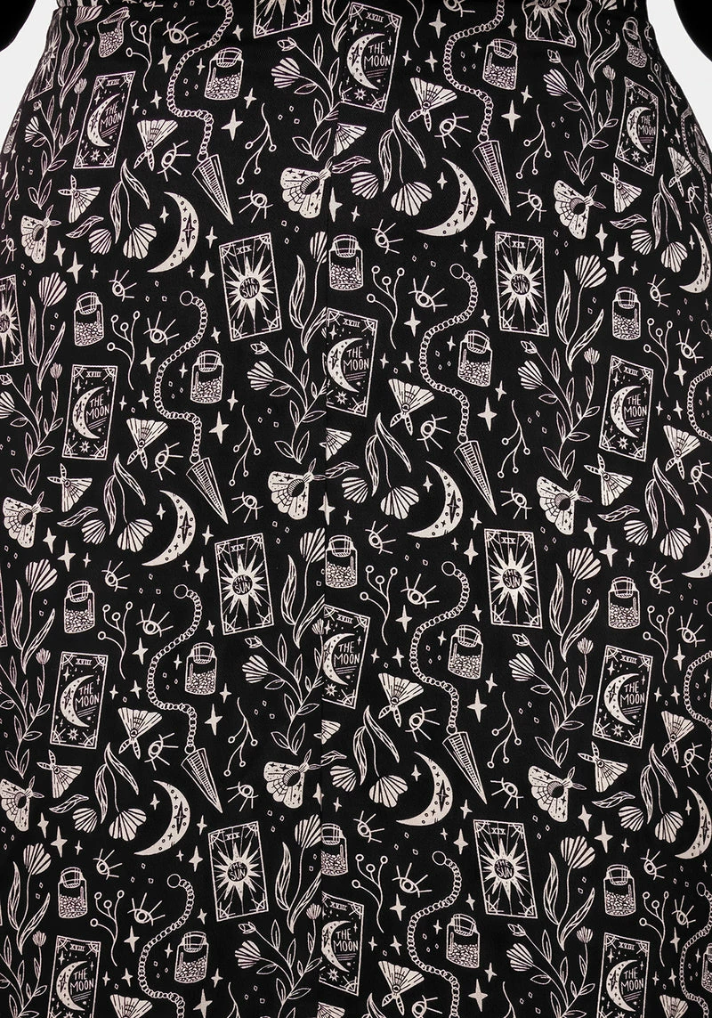 – All-over gothic witch discharge print in a creamy caramel colour (crisp & long-lasting)Â