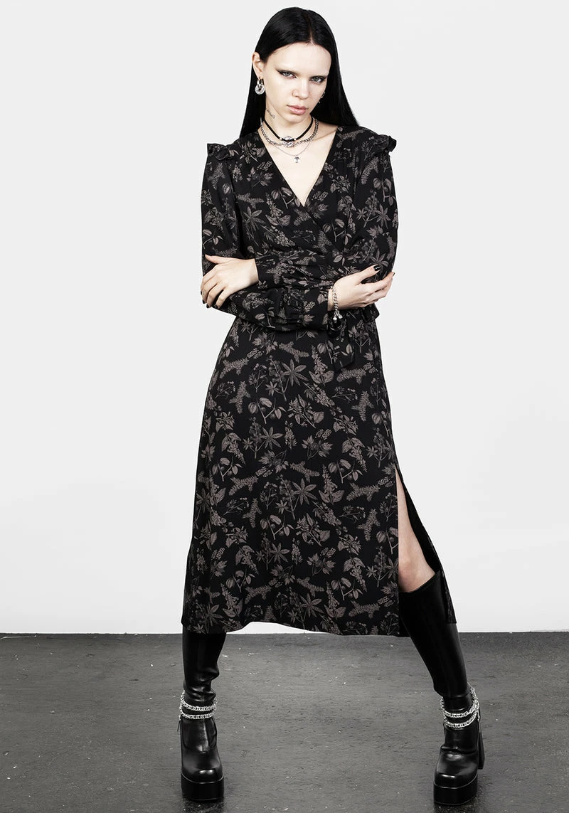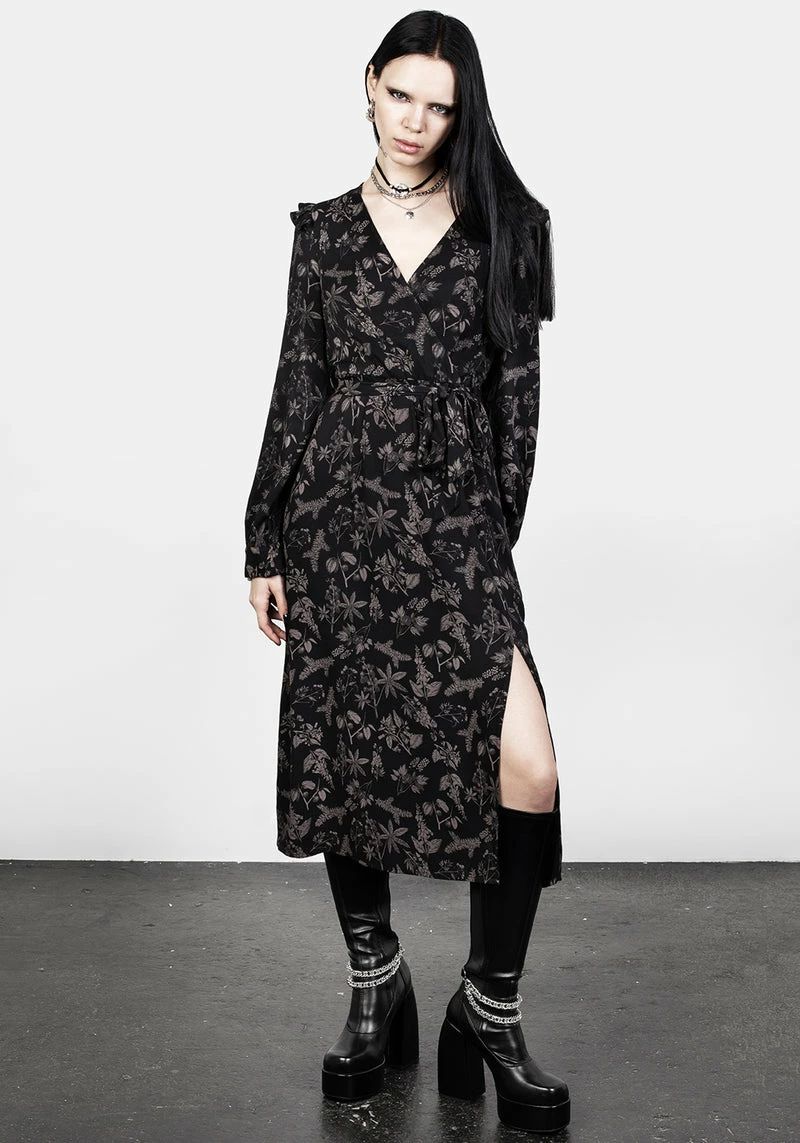 ✦ Faux wrap front secured with stitching and a self-fabric belt to cinch waist