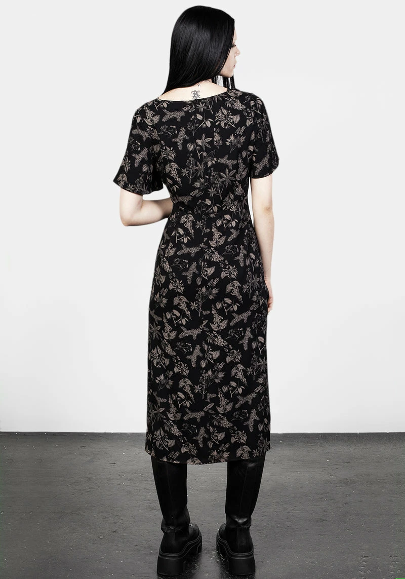 ✦ Black printed A-line midi dressÂ