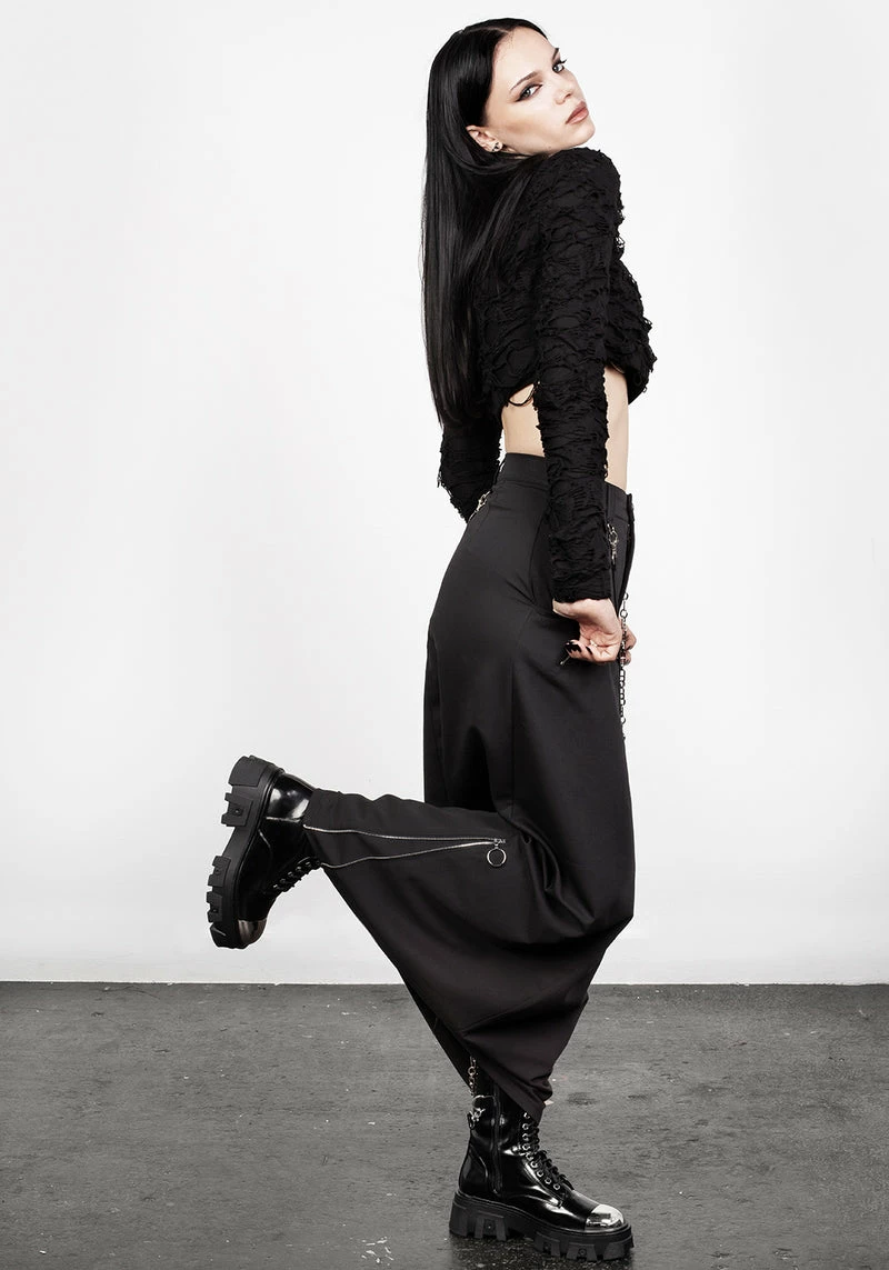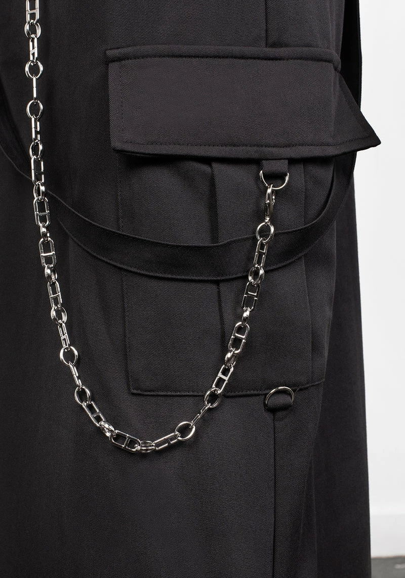 ✦ Silver hardware throughout including belt chains, self-fabric loops, and zipped side-splitsÂ