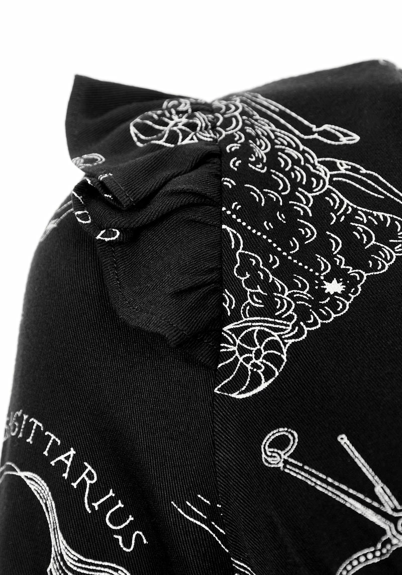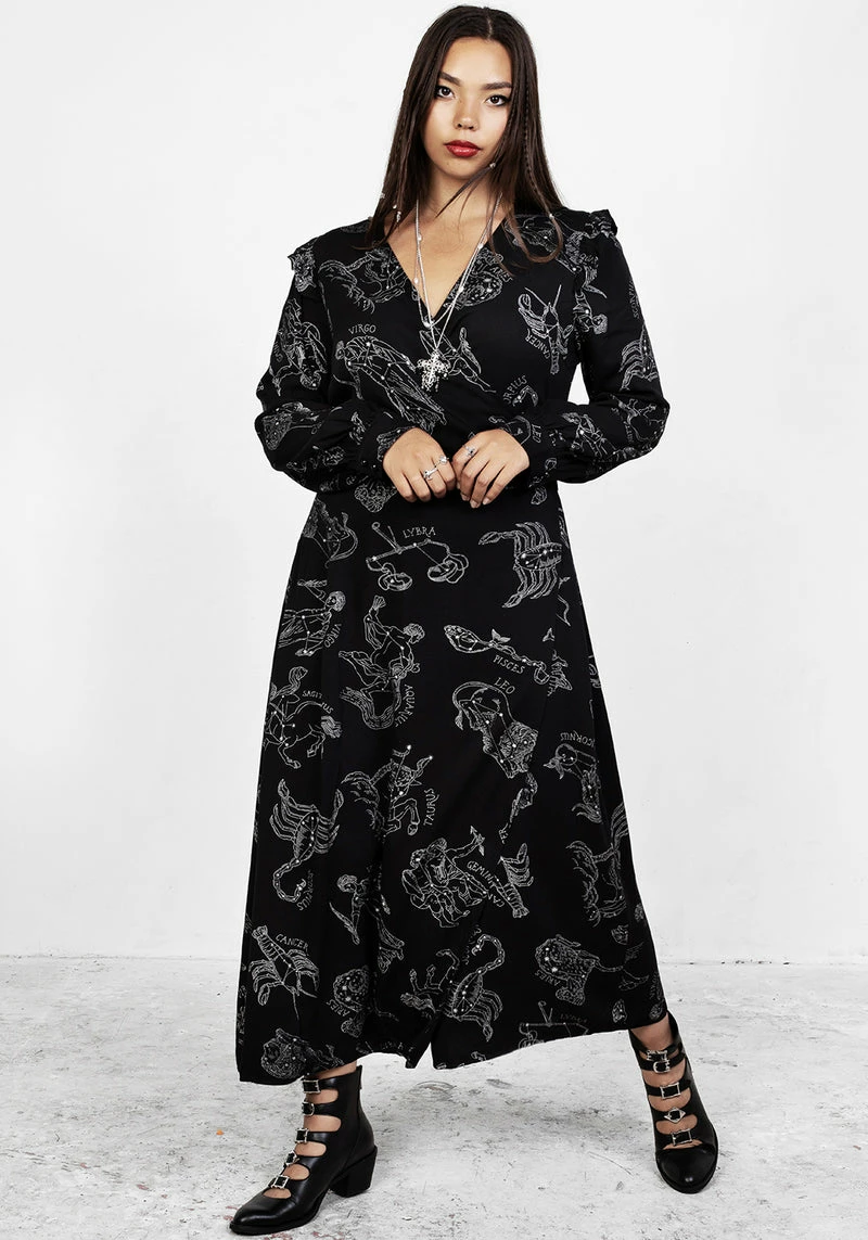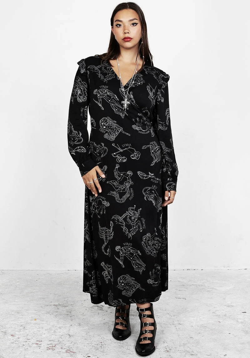 ✷ Self-fabric waist tie fastens at back for cinched-in silhouette