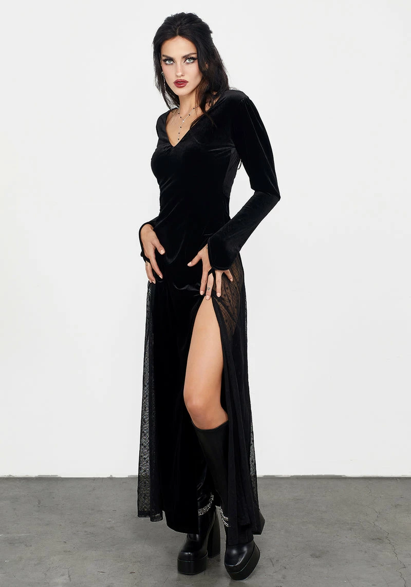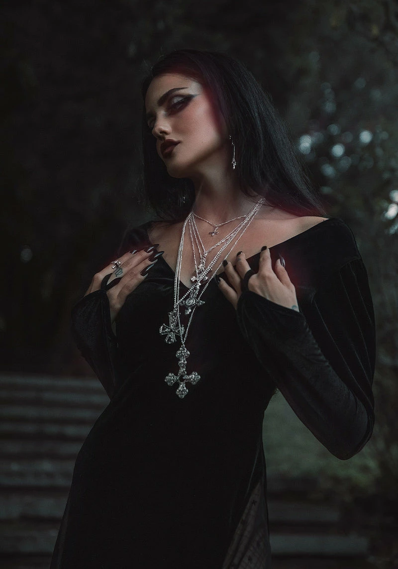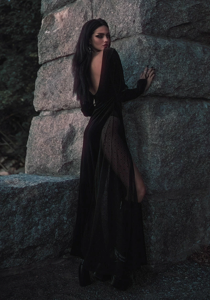 ✦ Deep V-neck and low-scoop back balance long leg-of-mutton sleeves