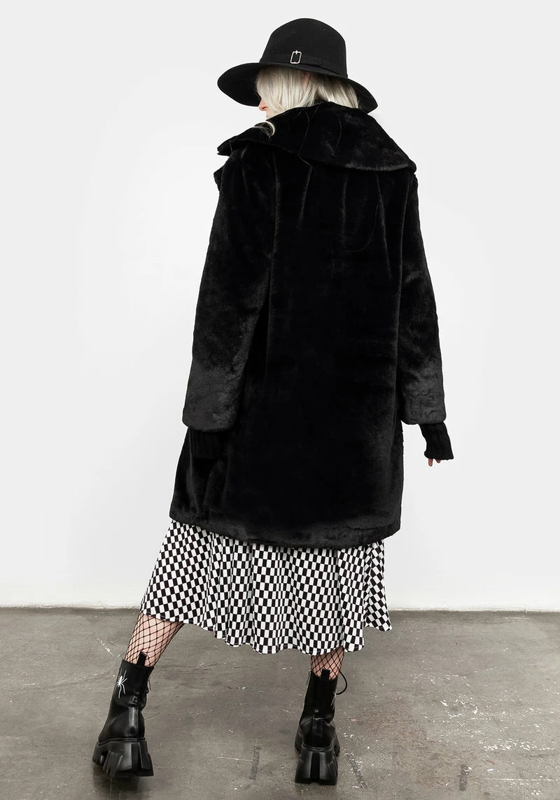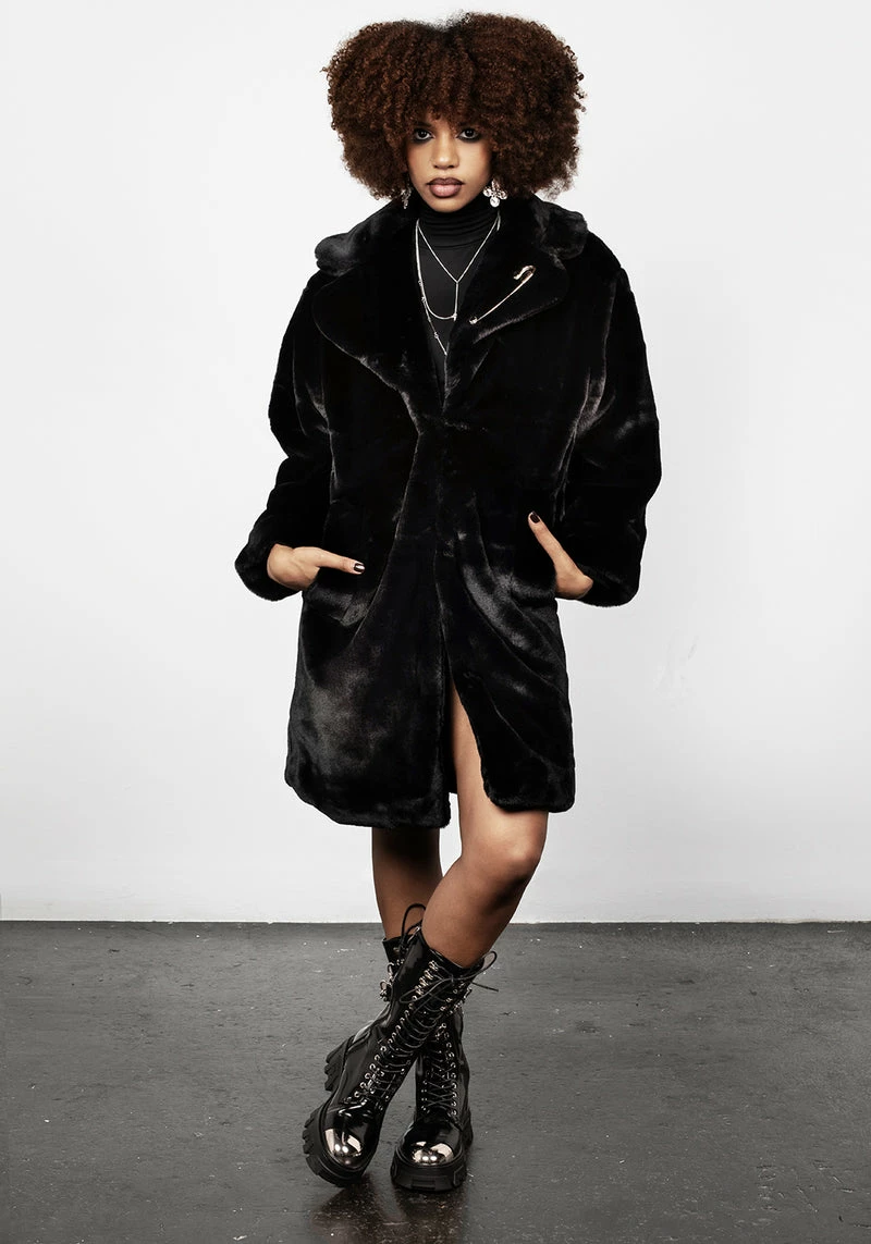 ❦ Oversized black faux fur coat with statement safety pin