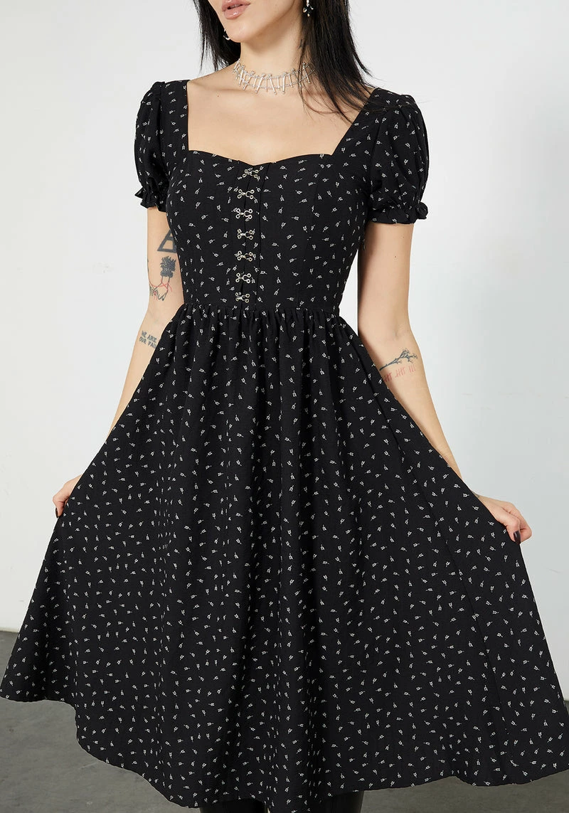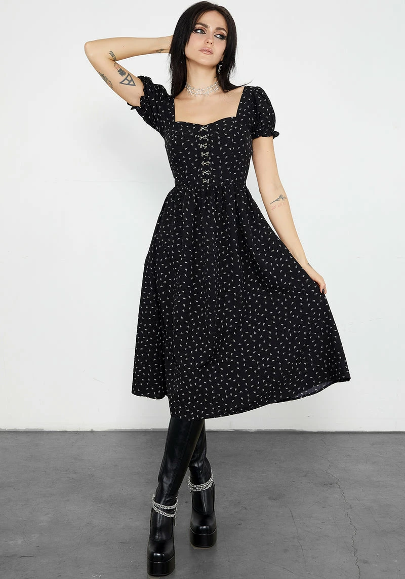 – Black printed midi dress with puff sleeves