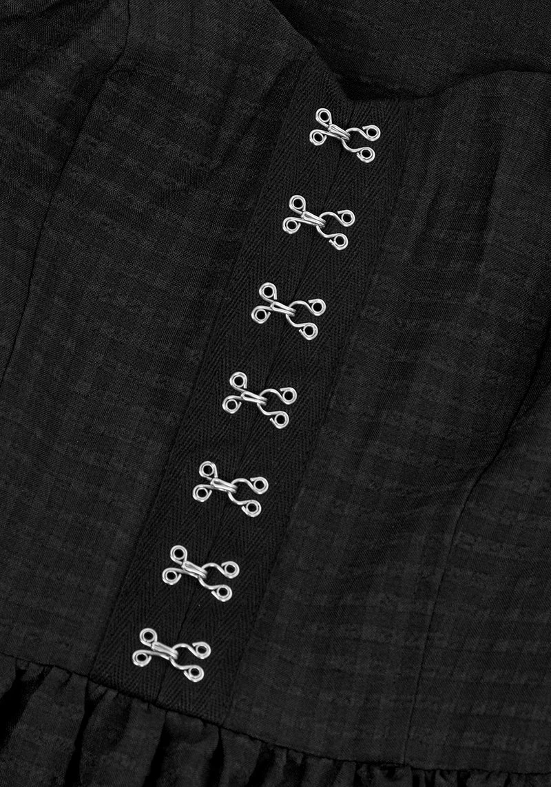 – Faux hook and eye fastenings down bust – concealed side zipper for easy dressing