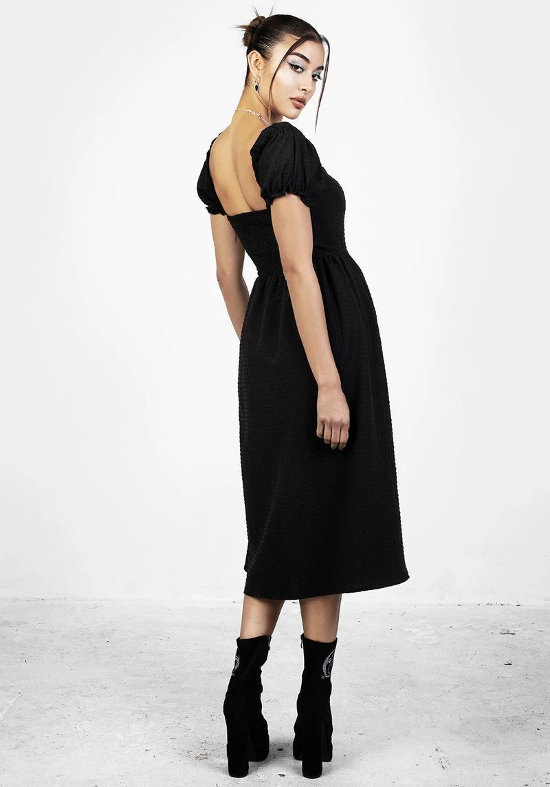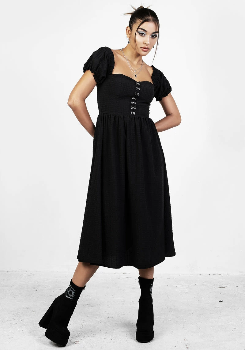 – Black gingham midi dress with puff sleeves
