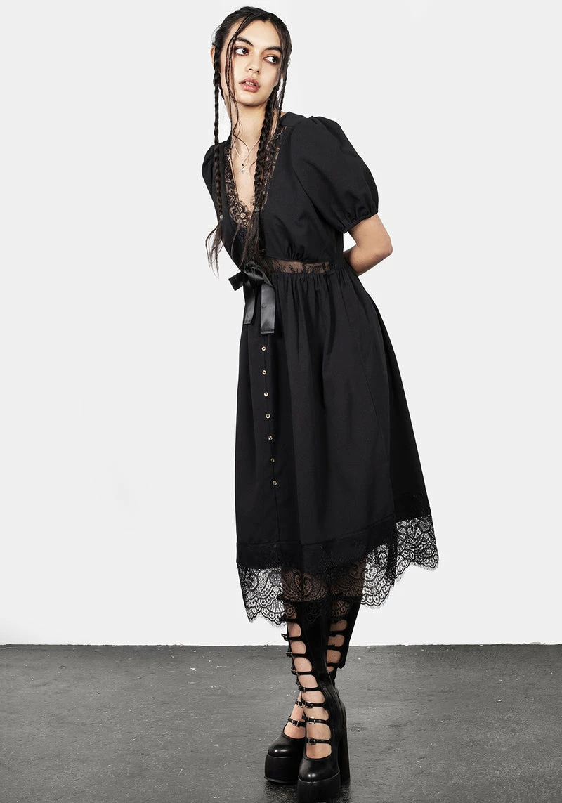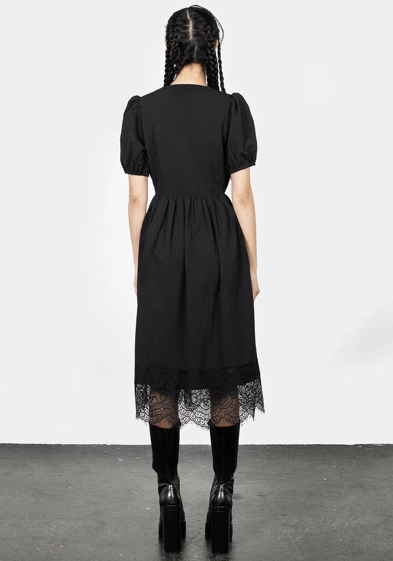 – Black midi dress with sheer lace panelling