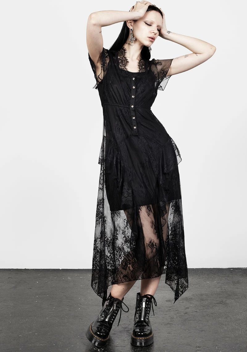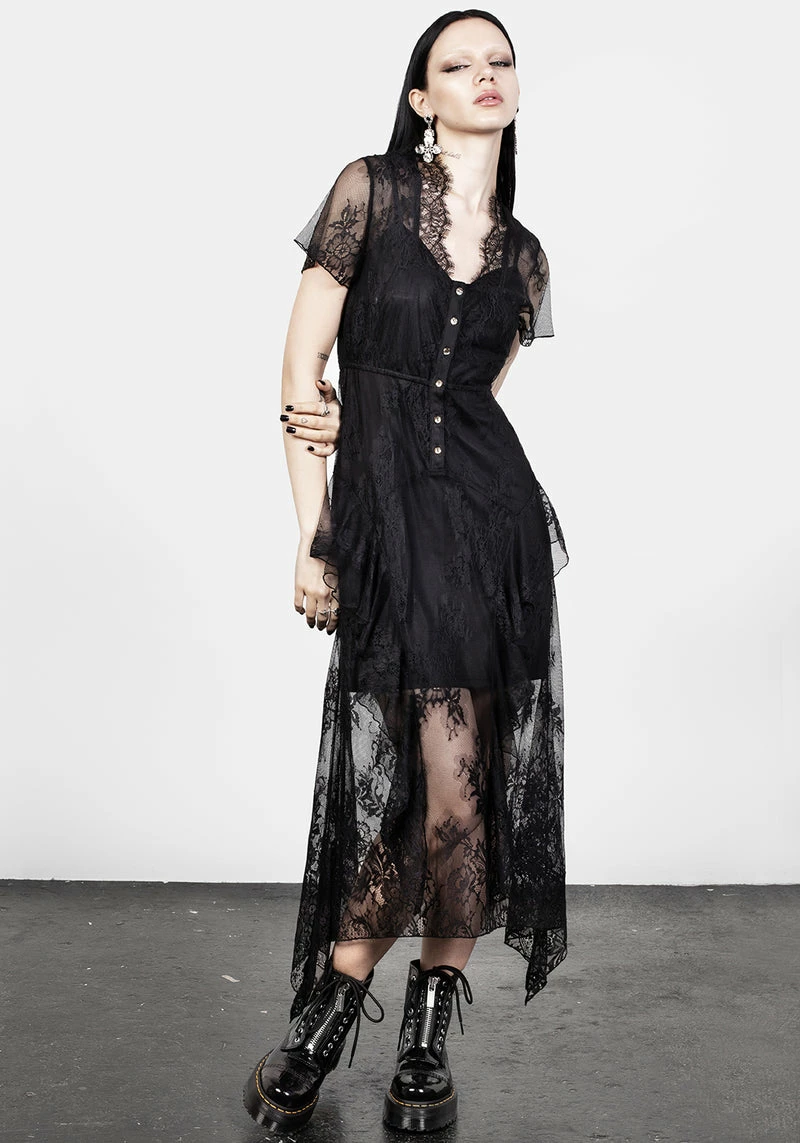 – Short, sheer flowy cap sleeves and pointed-hem skirt with front ruffles – such drama!