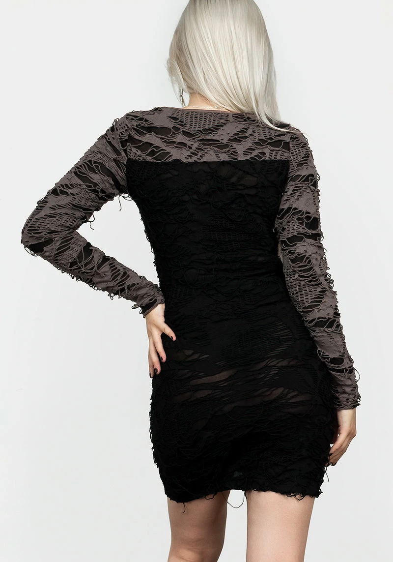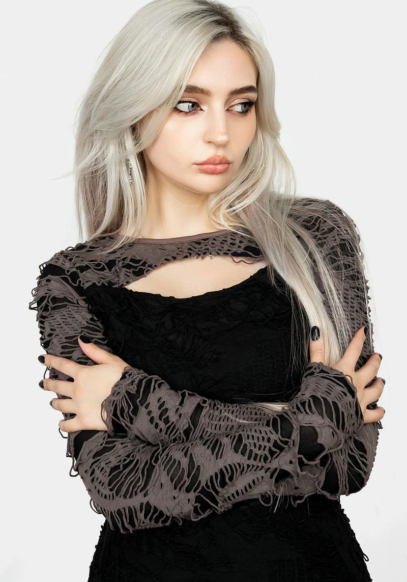✦ Extreme distressed, purple-toned grey and black jersey layered over sheer black lining