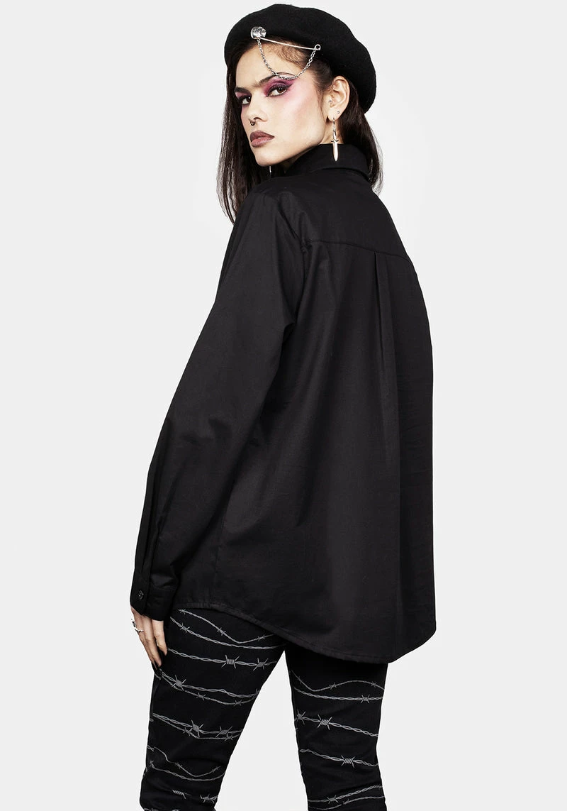 – Classic collar & long sleeves ending in flat buttoned cuffs contrast punk iconographyÂ