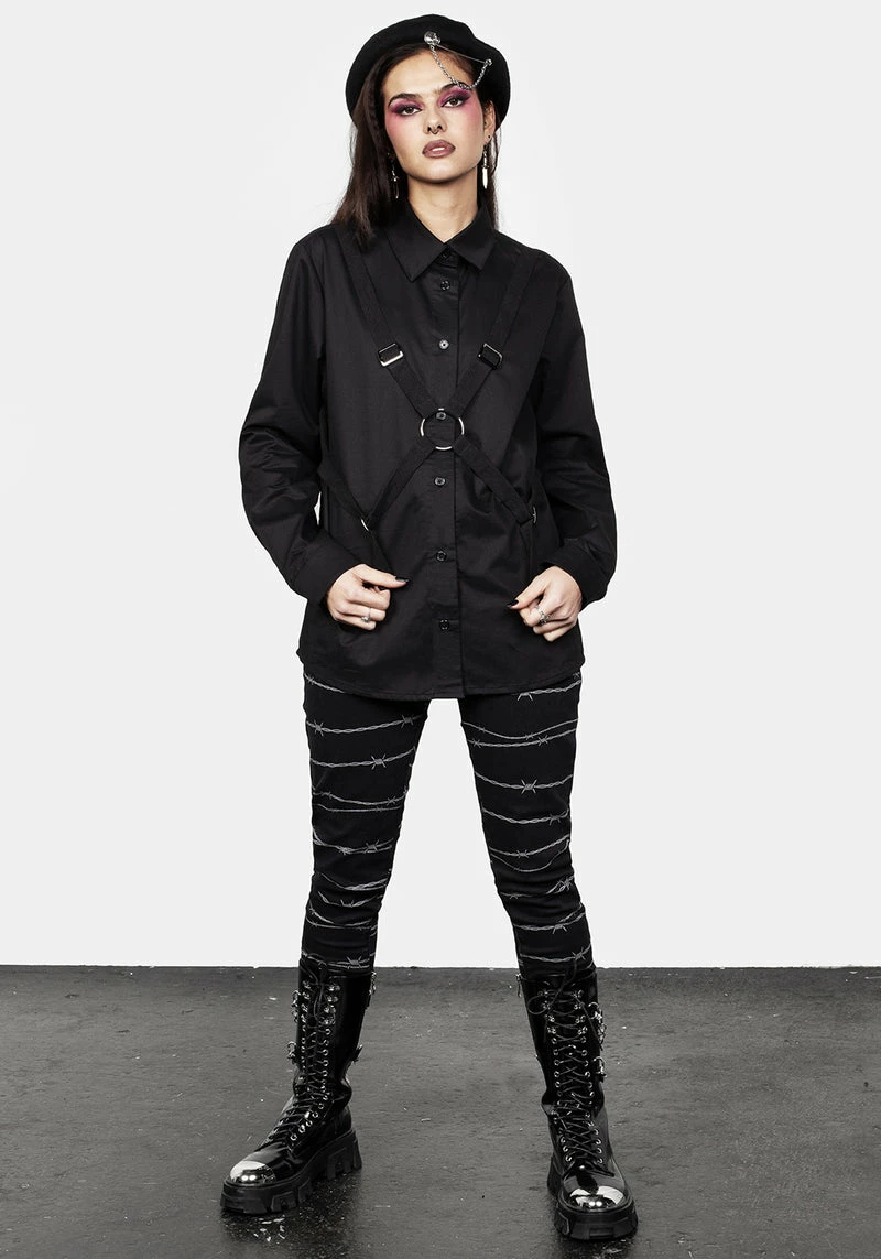 – Black button-up collared parachute strap shirtÂ