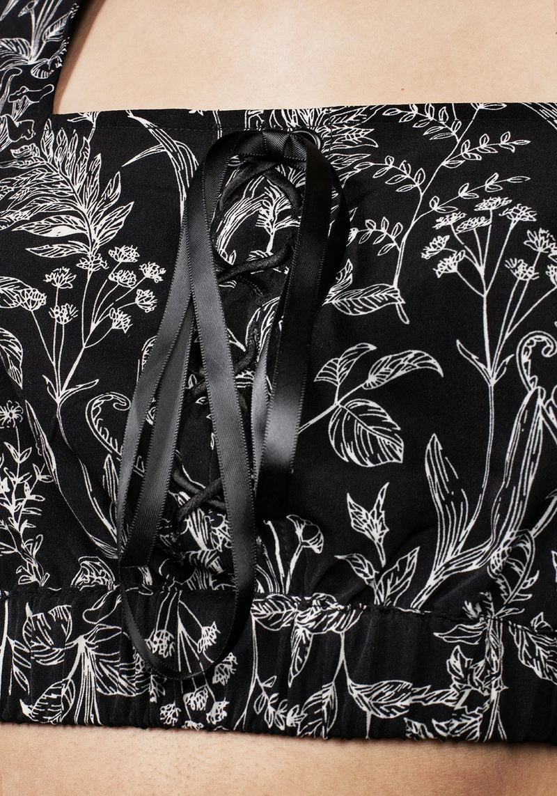 – Black ribbon lace-up detail threaded through sewn eyelets on centre frontÂ