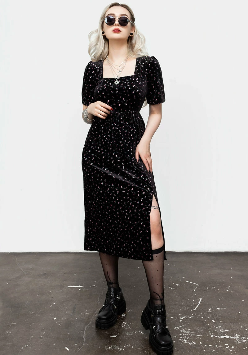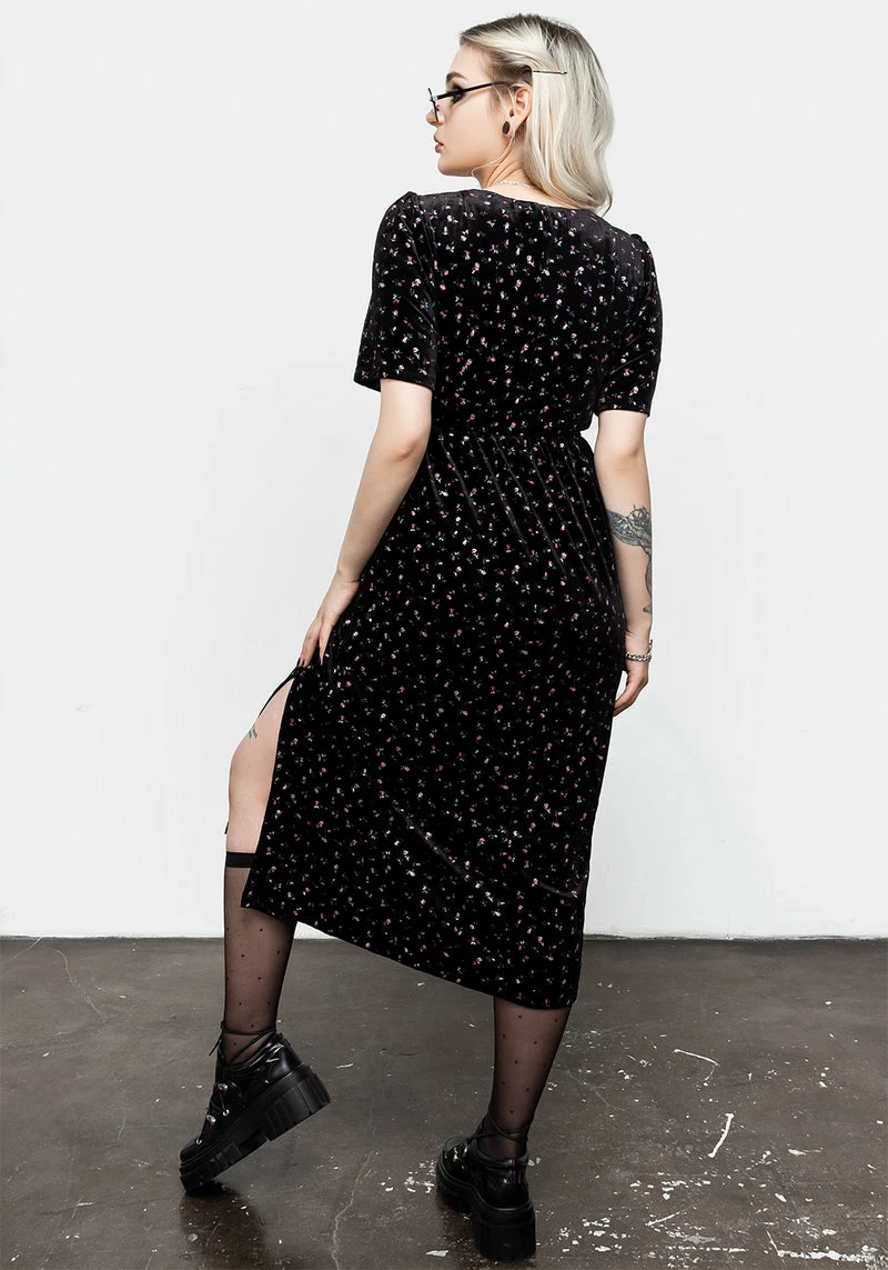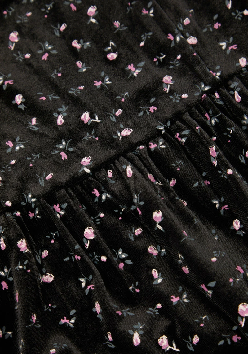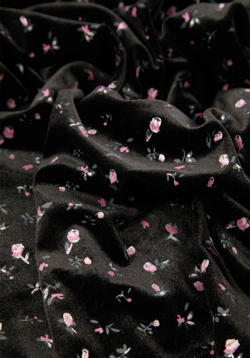 – Rich black velvet printed with an all-over lilac glitter floral designÂ