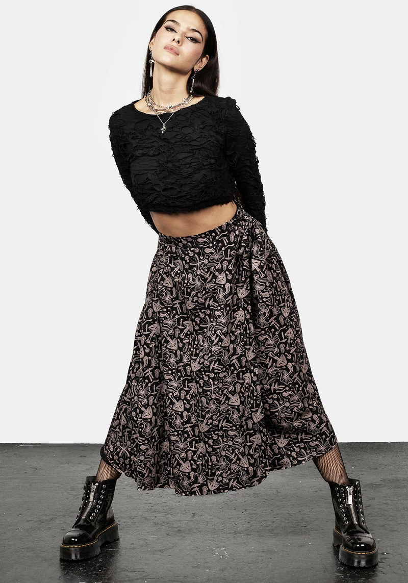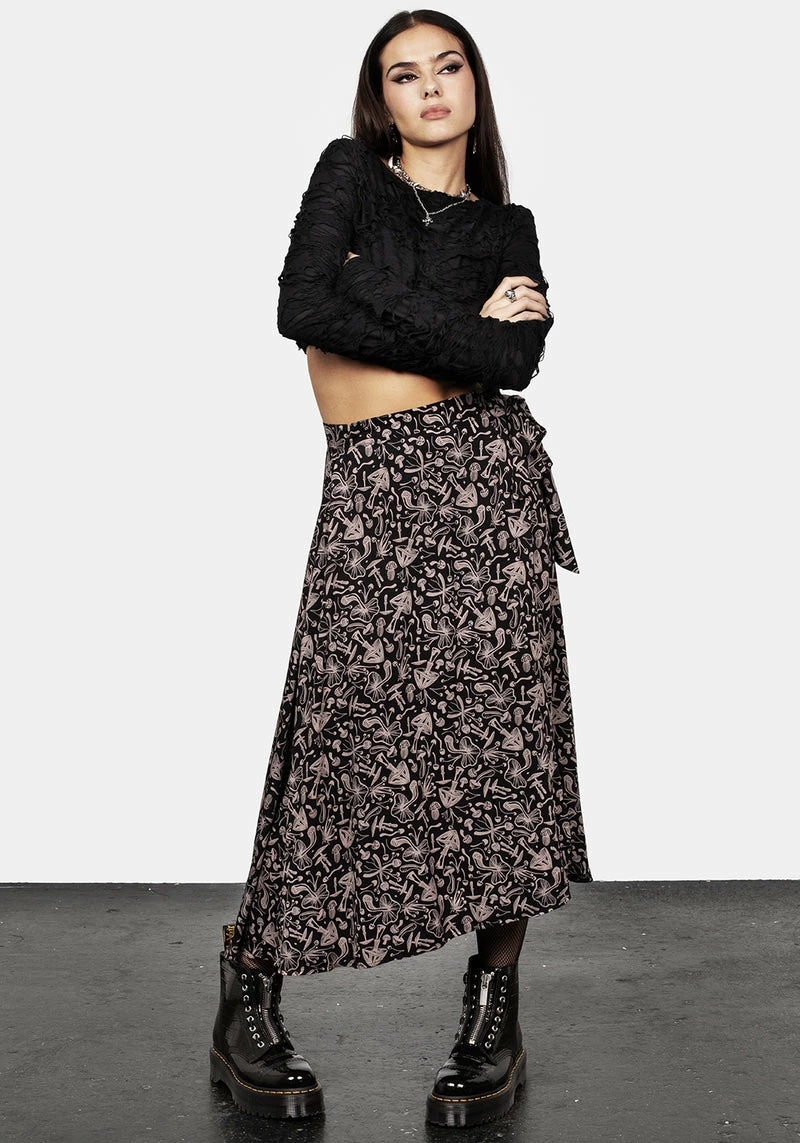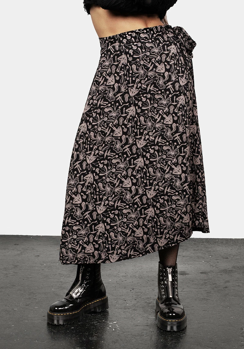 – Black mushroom printed midaxi wrap skirt Â