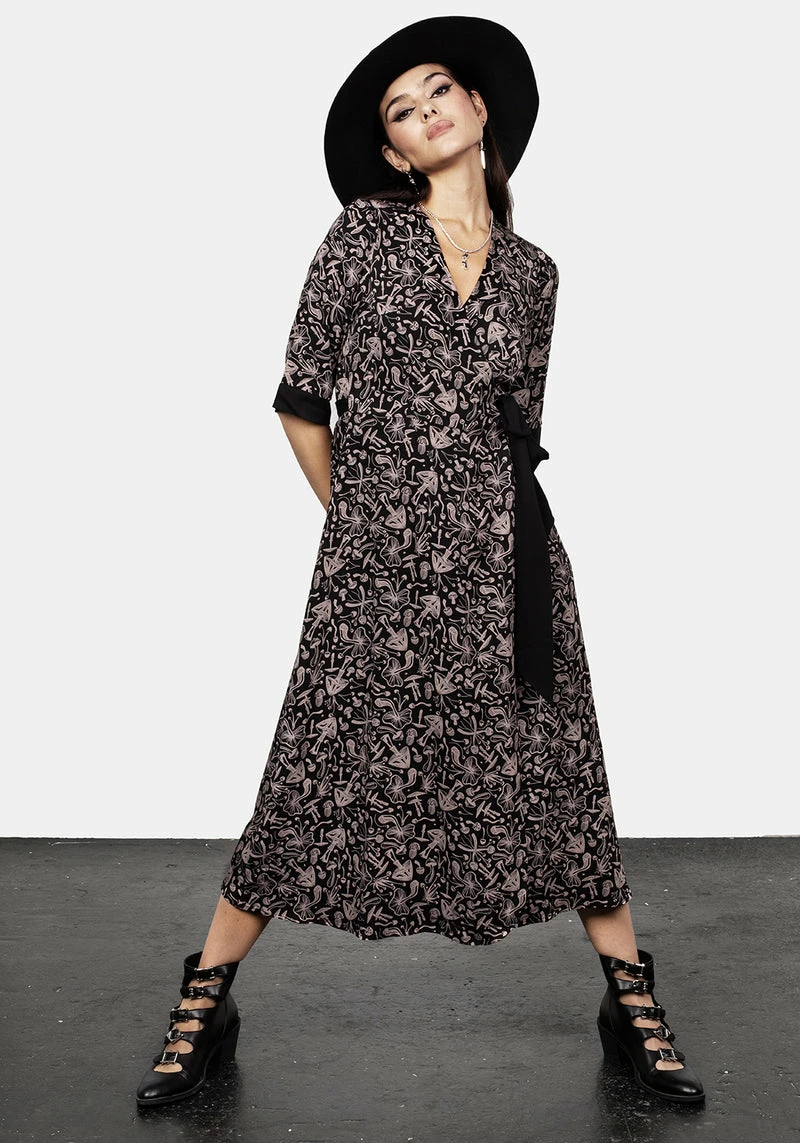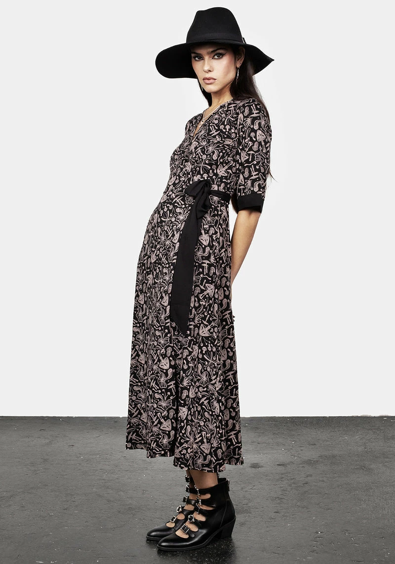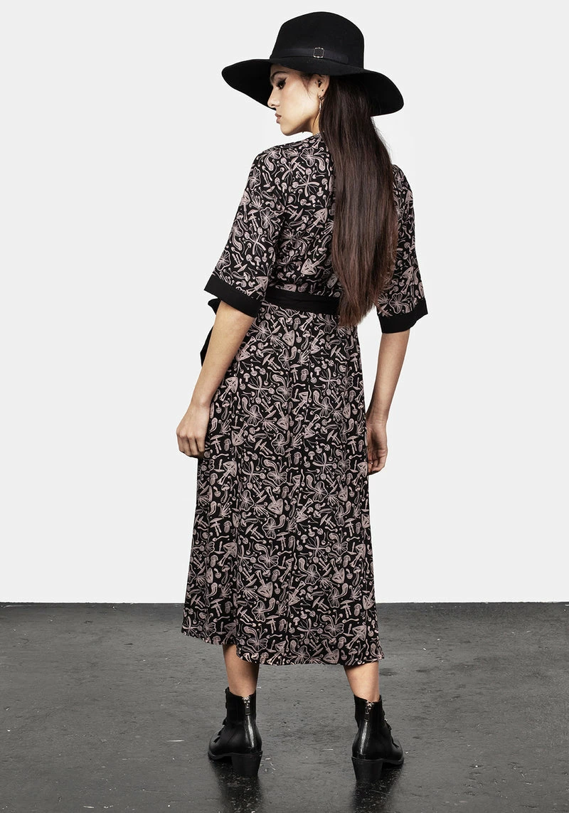 – Black mushroom print midi wrap dress